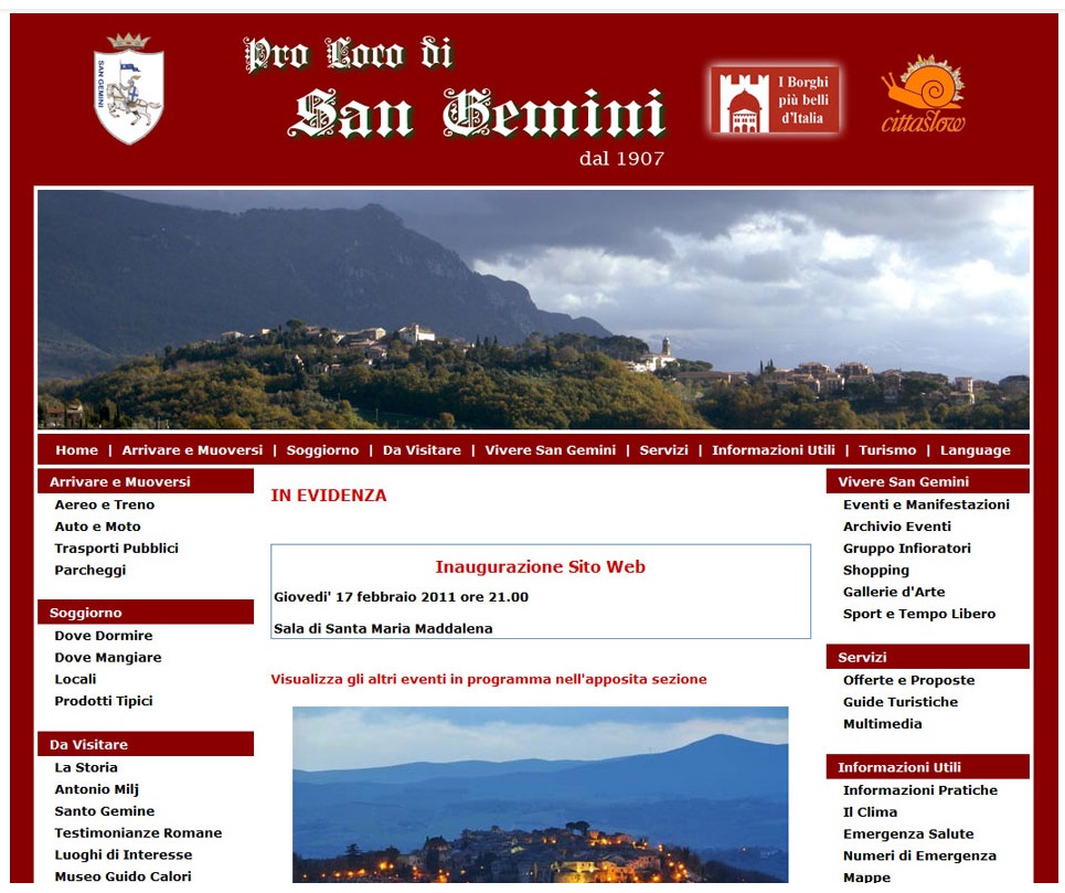 Questo è il frame realizzato per il sito web della Pro Loco di San Gemini, online dal 27/11/2010 ai primi giorni del 2014. Realizzato su frame custom basato su tecnologia PHP MySQL su ambiente Linux, il sito presentava tutte le informazioni turistiche e ricettive sulla cittadina di San Gemini che potevano interessare sia i turisti che i curiosi. Era presente una sezione “Eventi” ed un archivio degli eventi precedenti, nella quale si poteva aver notizia delle varie manifestazioni o eventi culturali in programma.